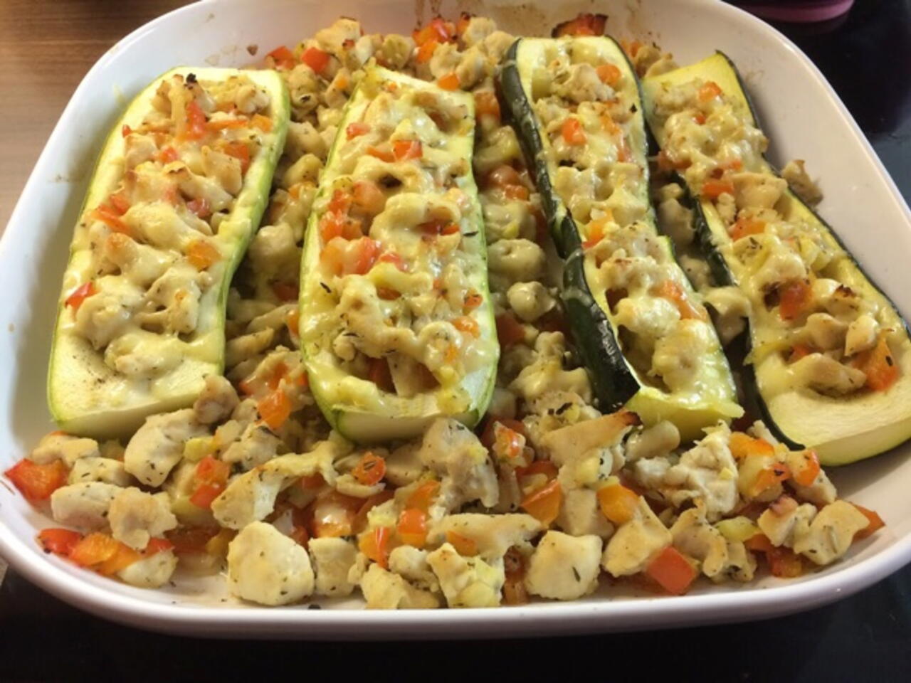Разрезать кабачок вдоль на 2 равные части, вынуть мякоть и сформировать лодочки, чтобы они были одинаковыми со всех сторон
