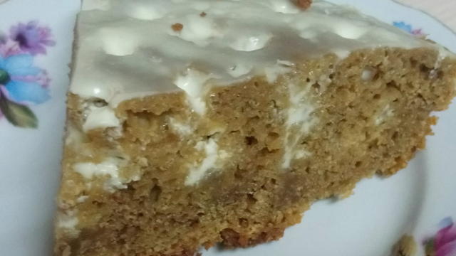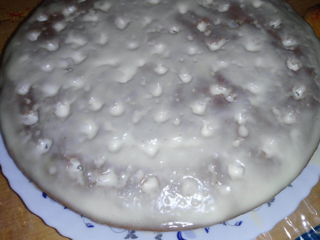По поверхности кекса делаем множество проколов с помощью палочки для суши. И пока еще кекс горячий покрываем его половиной сметанного крема. И оставляем на 15-20 минут.
