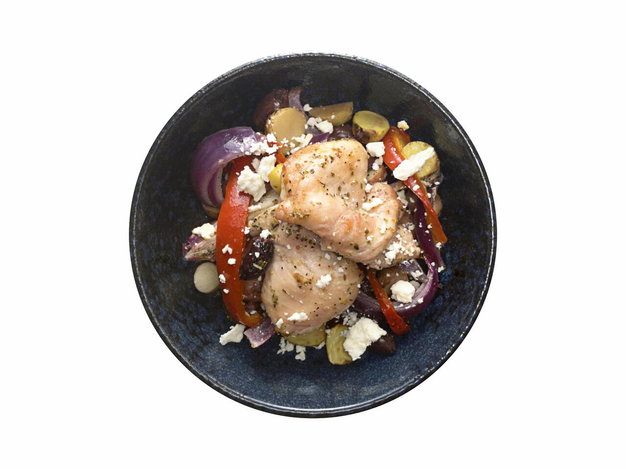 Ужасно простое и переполненное ароматом блюдо. Сладкий обжаренный лук и красный перец с солеными оливками и сыром фета преображают слегка приправленные куриные бедра.