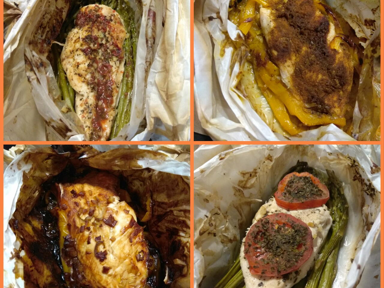 На пекарскую бумагу положить половину спаржи, сверху положить куриное филе. Филе поперчить и посолить с двух сторон, положить 2 дольки помидора и посыпать орегано. По желанию, можно положить 2 кружка моцареллы