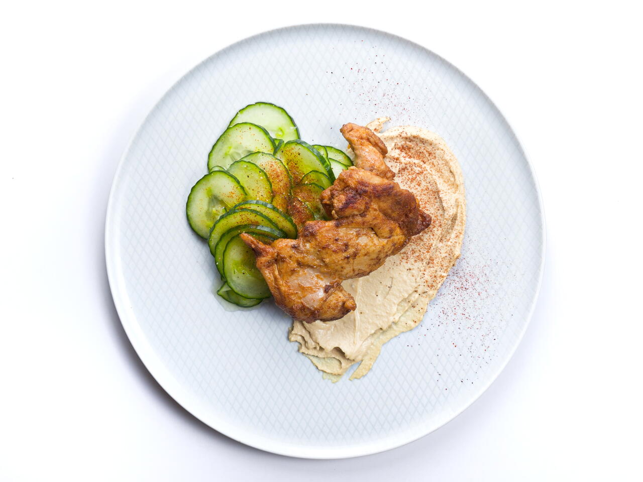 Куриные бедра с хумусом и огурцами