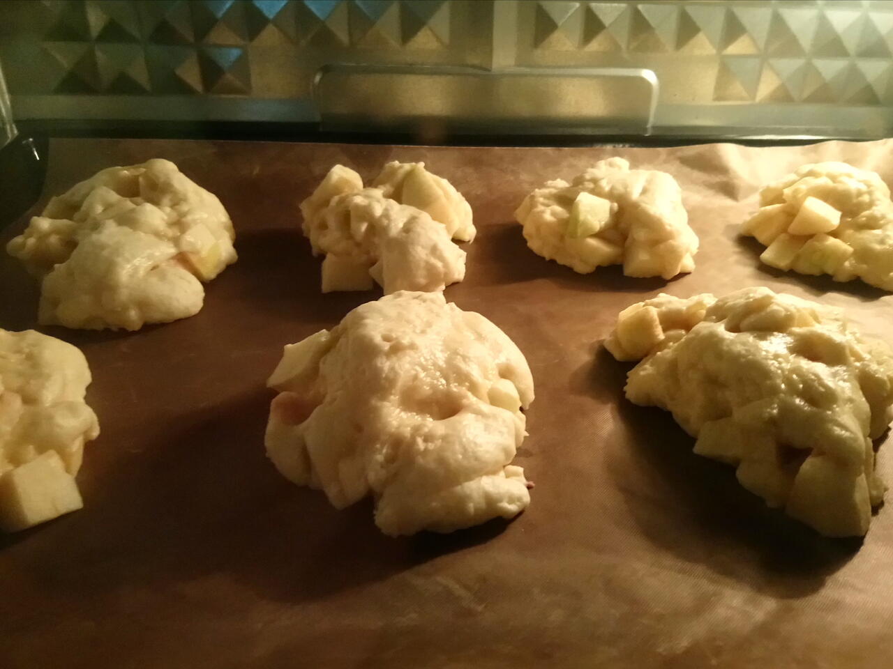 Ложкой выкладываем на пергамент (примерно 1,5 ложки теста на пирожок) на расстоянии друг от друга 5 см.