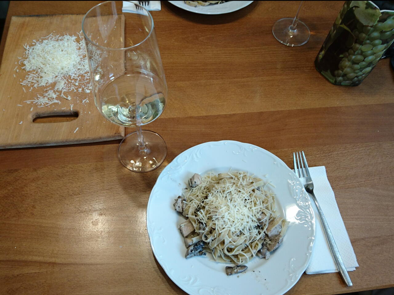 Натереть пармезан, полить пасту соусом из чашки, налить белого винишка и радостно все сожрать :-)