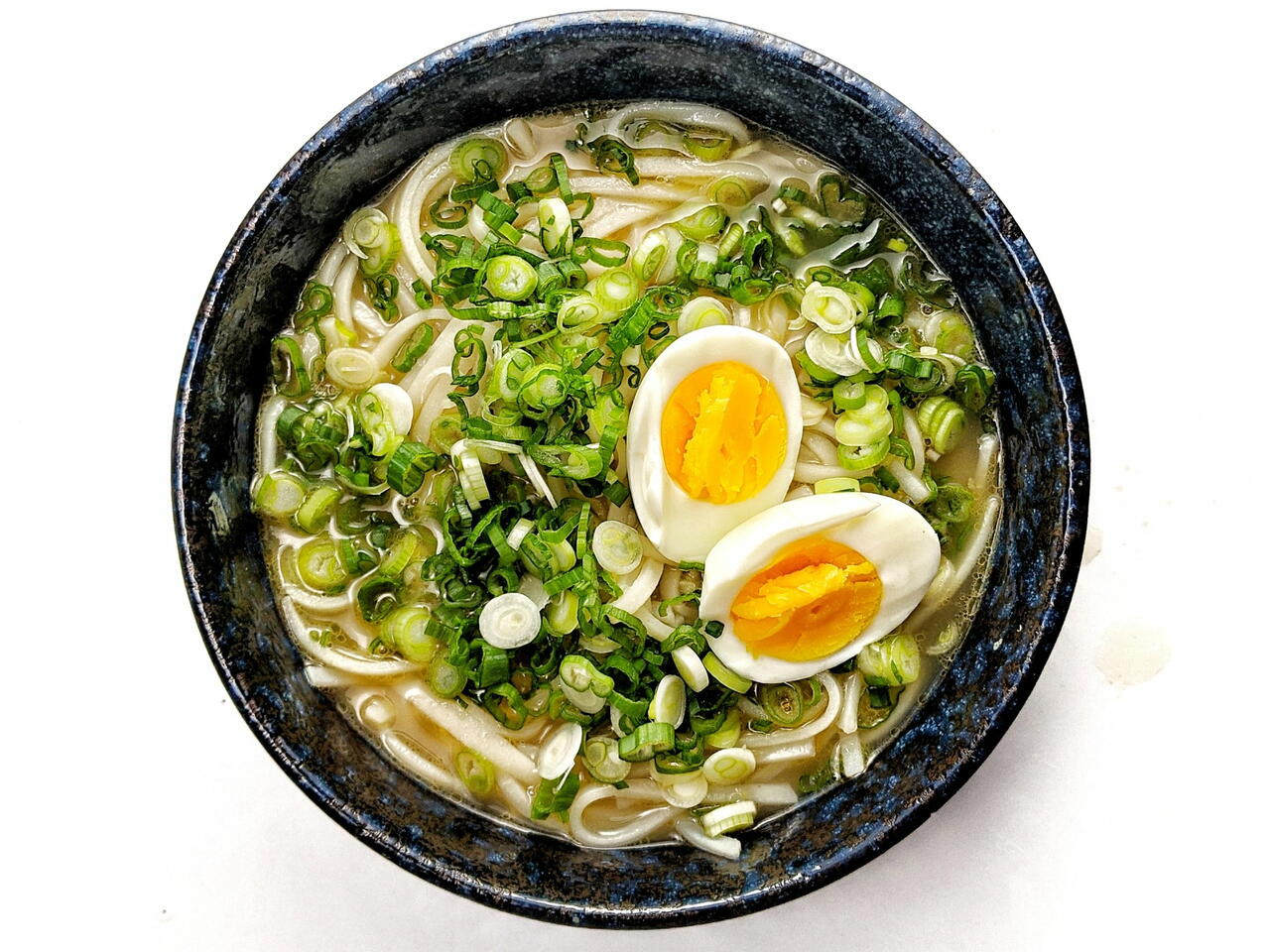 Разделите лапшу на 2 миски. Сверху залейте бульоном. Украсьте зеленым луком и яйцом всмятку.