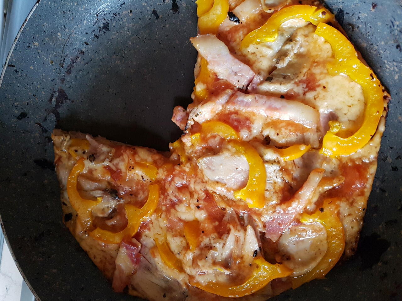 Пицца готовится примерно 20 мин и очень легко. Единственное она получается не большая и по количеству на 2 людей, поэтому можно делать на 2 сковородах.