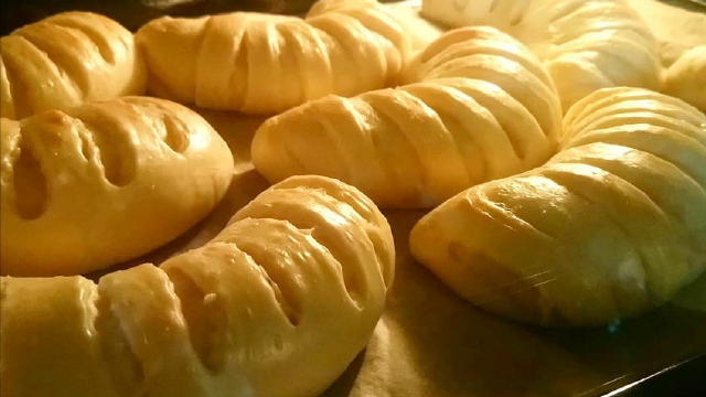 Отдохнувшее тесто раскатываем в прямоугольник. На один край укладываем одну столовую ложку с горкой крема и накрываем частью теста и защипываем. Примерно половина пласта – «пирожок» а второй остается плоским. Плоскую часть надрезаем на небольшие полоски 1,5-2 см: от «пирожка» к краю, но не до конца. Закручиваем пирожок по надрезанным полоскам (сворачиваем рогаликом). Должна получится, похожая на гусеницу, булочка.
