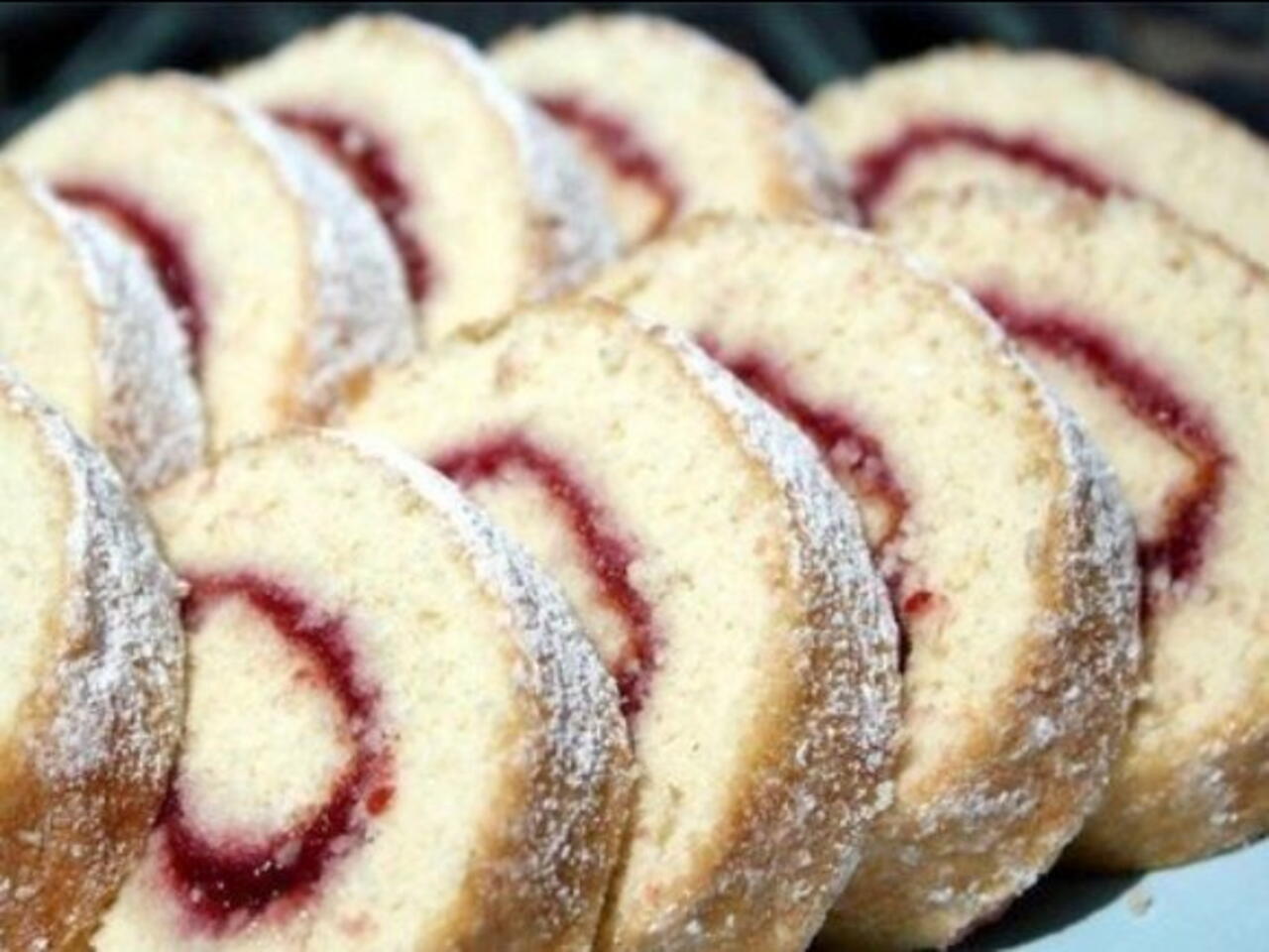 Итак, снимаем с огня джем и достаем из духовки корж. Снимаем бумагу и смазываем одну сторону теплым джемом, заворачиваем в рулет и обильно посыпаем сахарной пудрой.6. Даем остыть и можно заваривать чай!