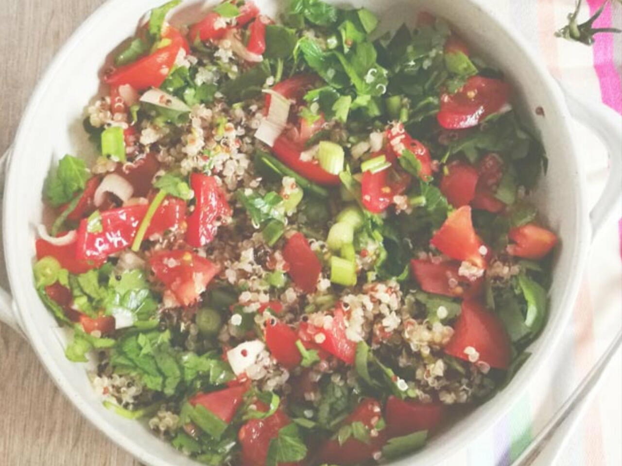 Помидоры нарезать кубиками, лук и петрушку измельчить, сложить все ингридиентыв салатницу и залить дрессингом