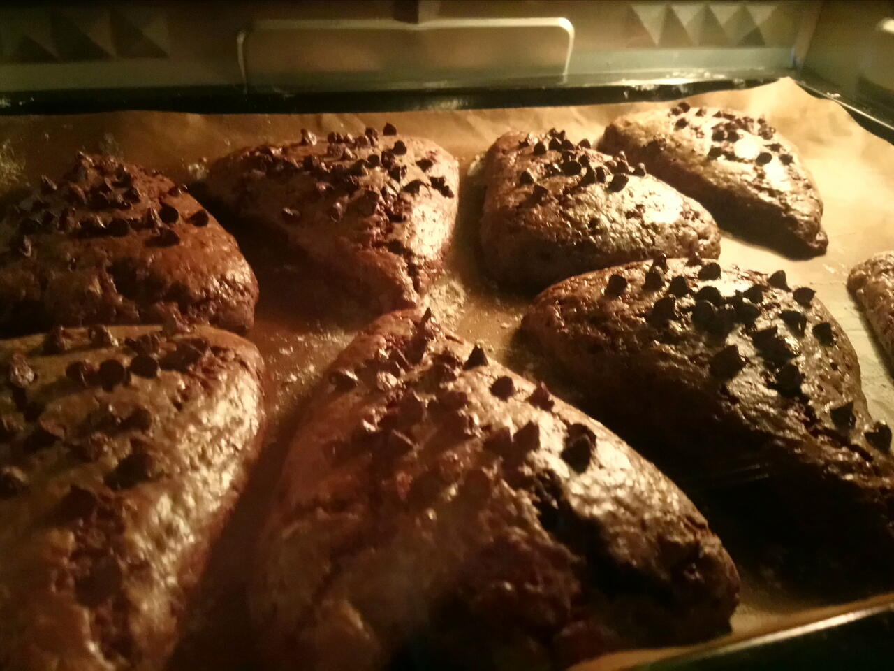 Делим тесто на 8 сегментов и аккуратно перекладываем на противень застеленный пергаментом. Смазываем яйцом или молоком и сверху посыпаем оставшимся шоколадом.