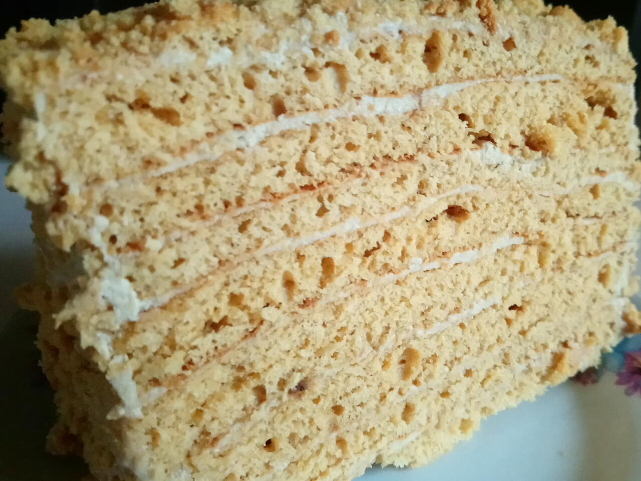 Промазываем коржи, укладывая друг на друга. Аккуратно промазываем бока и верх торта.