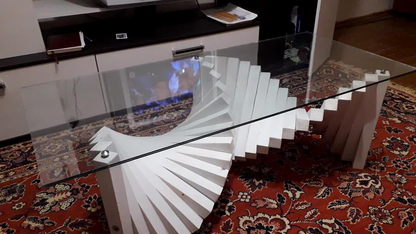 Я увидел отличный дизайн,но... сомнительное инженерное решение: всего лишь 3 точки опоры - для такого хрупкого материала, как стекло - чрезвычайно мало и рискованно, даже если использовать закалённое стекло. Другое замечание по эксплуатации: явное отсутствие защиты от внешней среды, загрязнения и т.д. Обработка дерева высокого качества,выигрыш в фактуре натурального дерева,но... Ненадолго! Дерево в таком беззащитном состоянии довольно быстро потеряет свой дизайнерский лоск