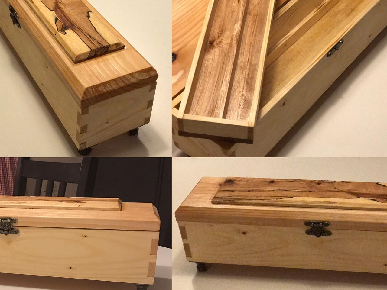 Make a dovetail box out of pine. Make a smaller box that fits inside it. Then just cut out a lid and decorate it. I used spalted birch.