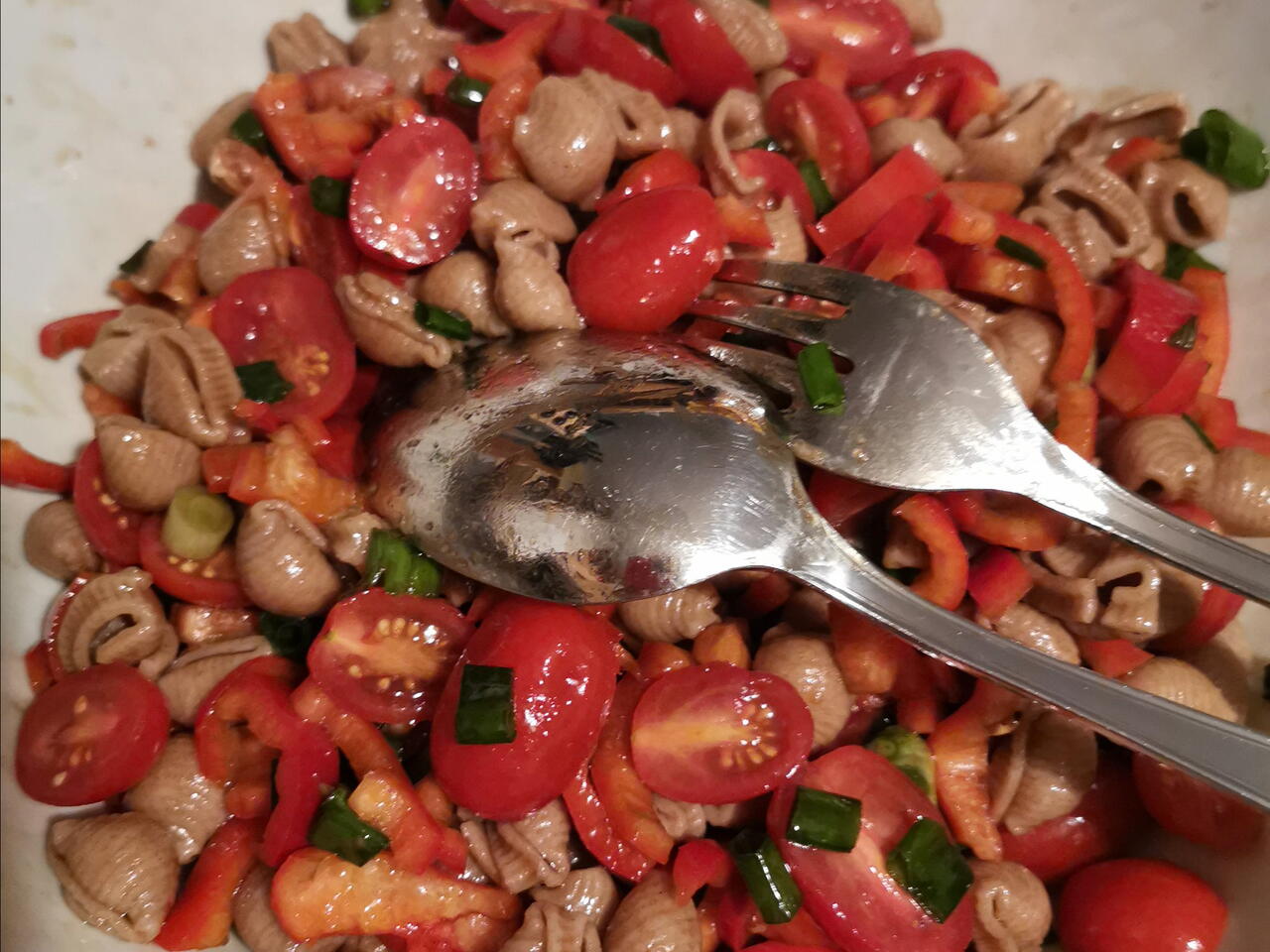 Skuhamo testenine v slani vodi al dente in dodamo vse ostale sestavine. Dober tek