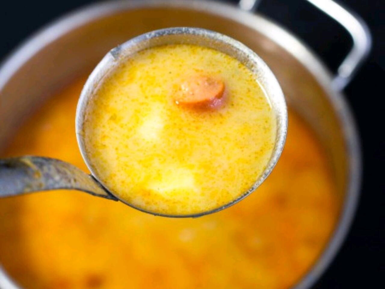 Potom pridáme na kocky nakrájané očistené zemiaky, ktoré v polievke povaríme asi pol hodinu. Ďalej pridáme do polievky na kolieska nakrájané frankfurtské párky a ešte aspoň 10 minút povaríme. Polievku osolíme, ochutíme korením podľa chuti. Celkom nakoniec pridáme do polievky na zjemnenie trošku mlieka a ešte krátko prevaríme.