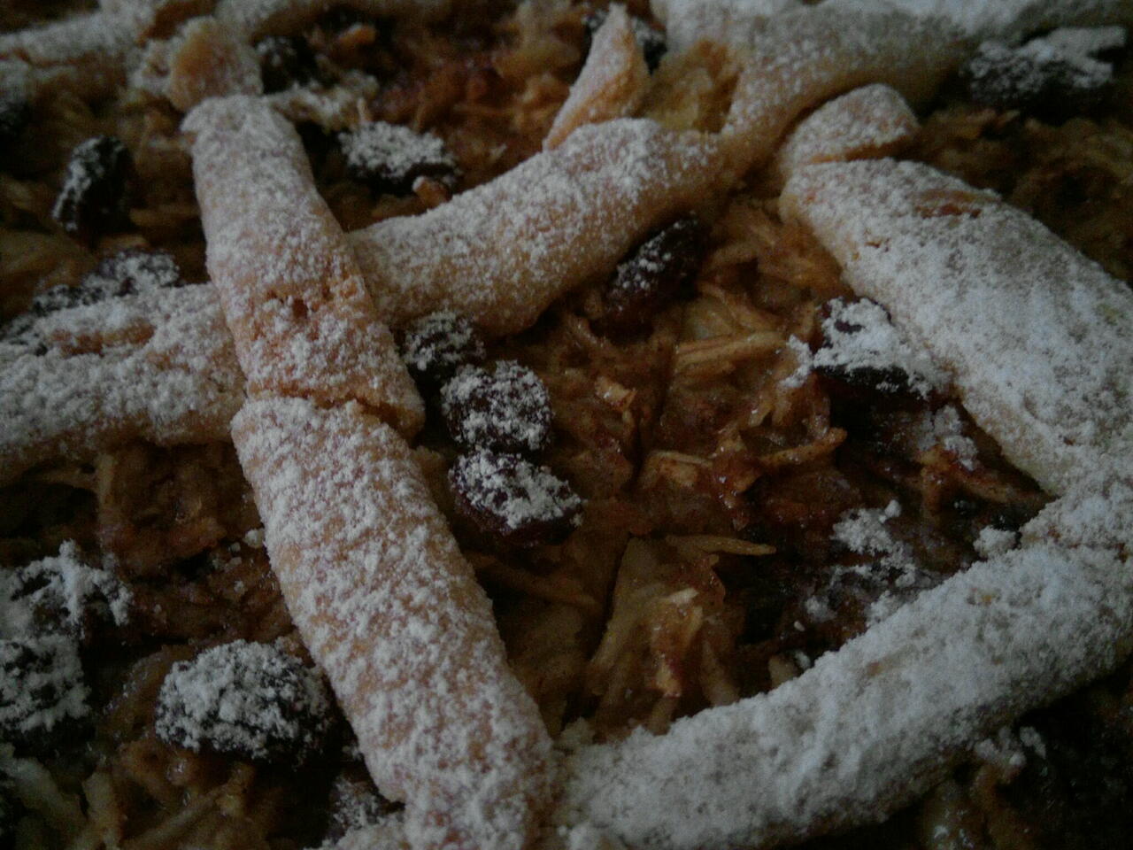 Na cesto nasypať postrúhané jablká, hrozienka a posypať kryštálovým cukrom a škoricu.