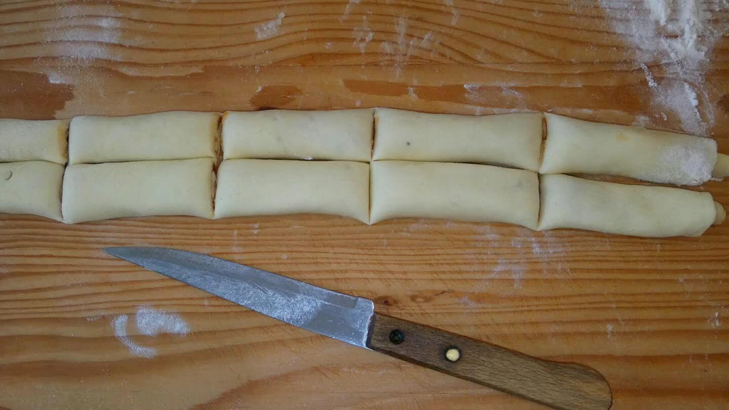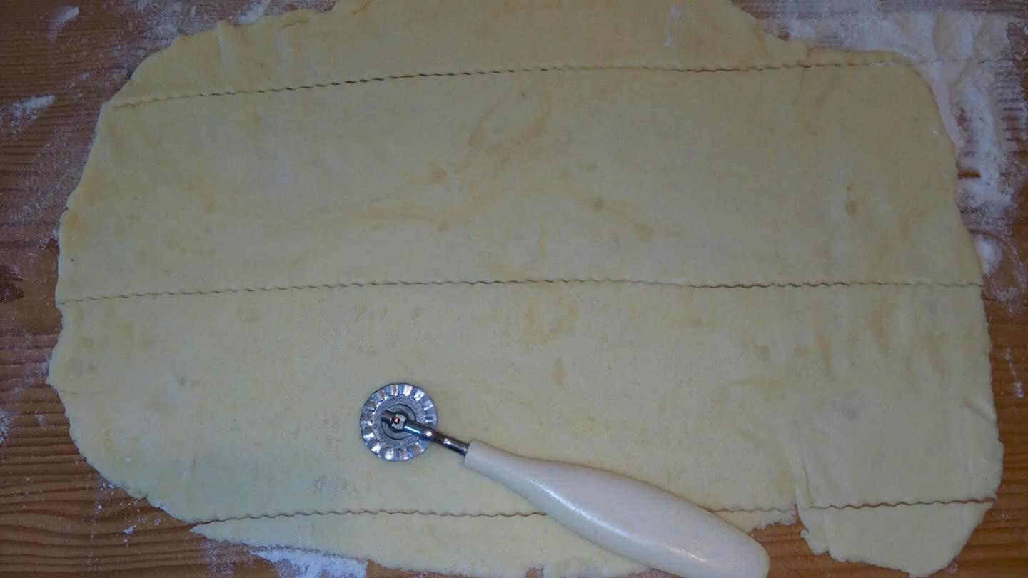 Zrolujeme a narežeme na 5-6 cm kusy.
