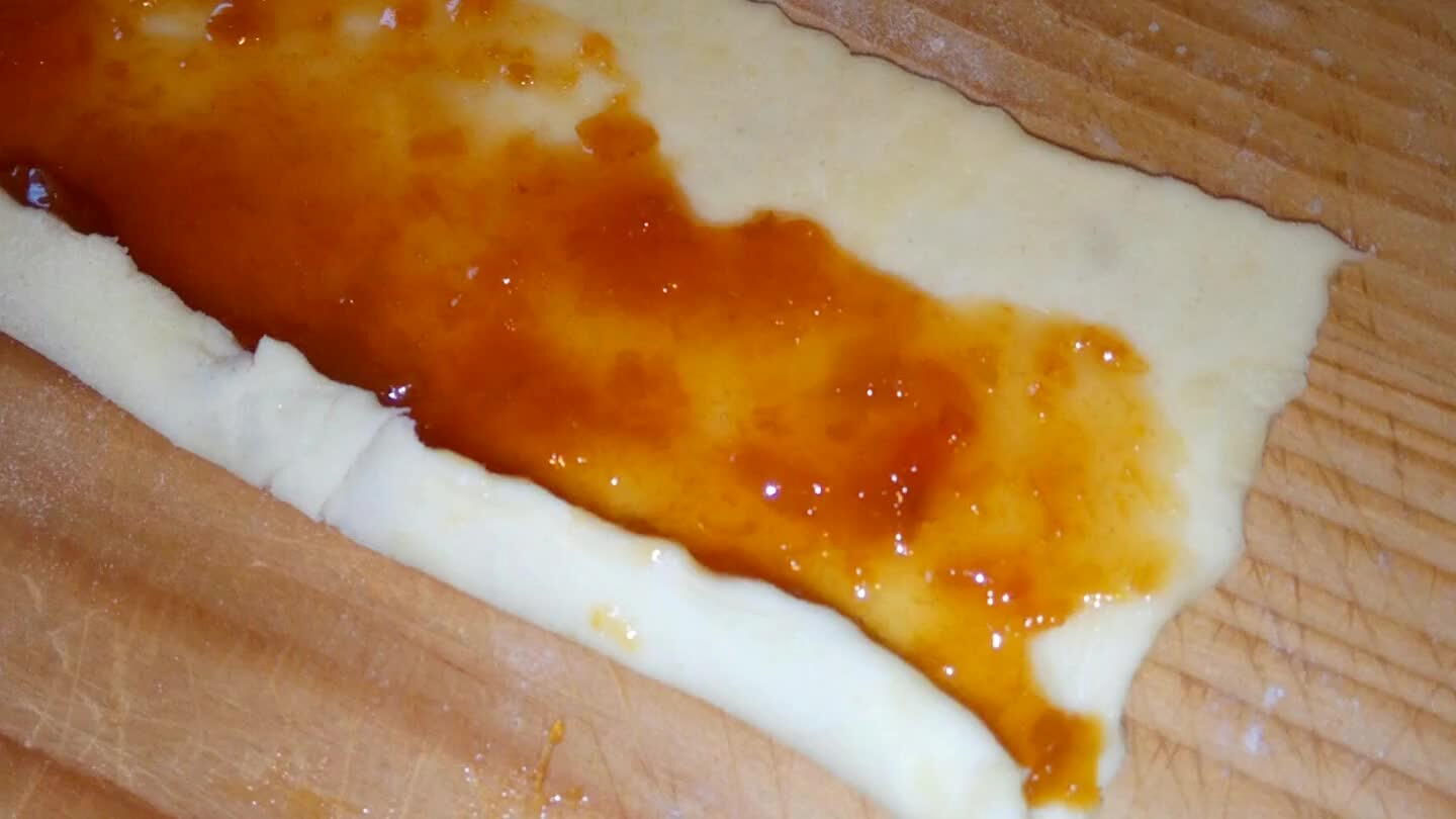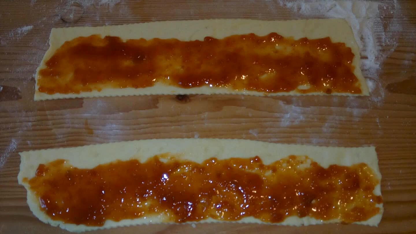 Polovicu cesta vyvaľkáme na obdľžnik. Hrúbka cesta 3 mm. Zvyšné cesto necháme v chladničke.