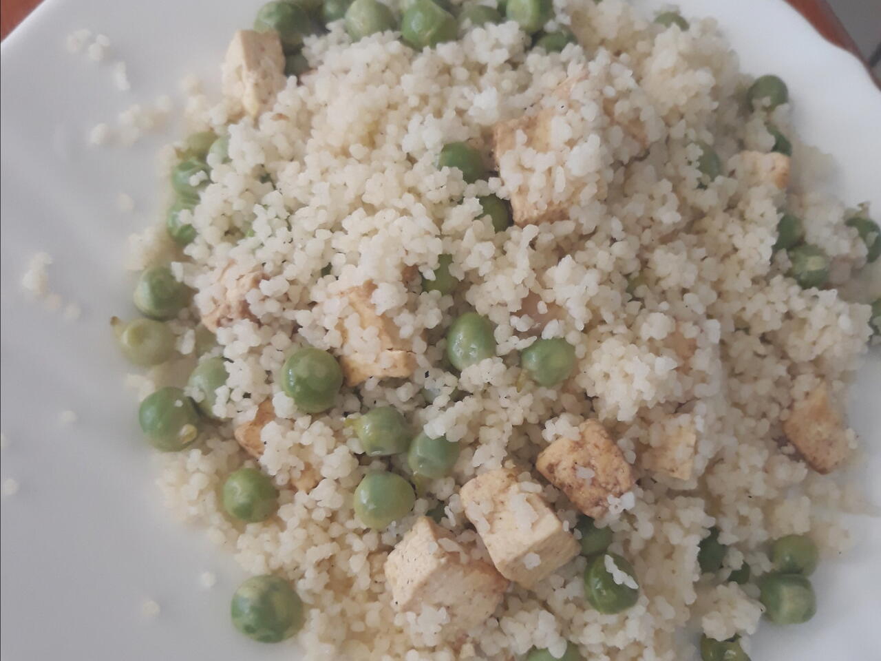 Hrnček kuskusu dáme do hrnca. Zalejeme 1,5 hrnčekom vriacej vody, pridáme kokosový tuk a zakryjeme pokrievkou, kým nám nezmäkne. Na panvici si zľahka orestujeme cibuľku spolu s hráškom.