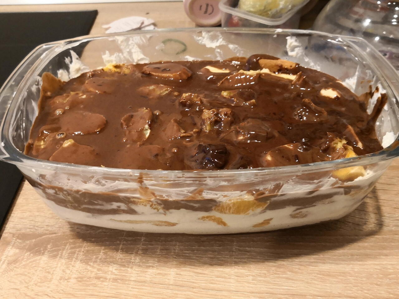 Túto zmes vylejeme a rozotrieme do formy vrstvy aby sme prikryli ovocie a piškóty. Navrstvíme ďalšie namočené piškóty a ovocie.