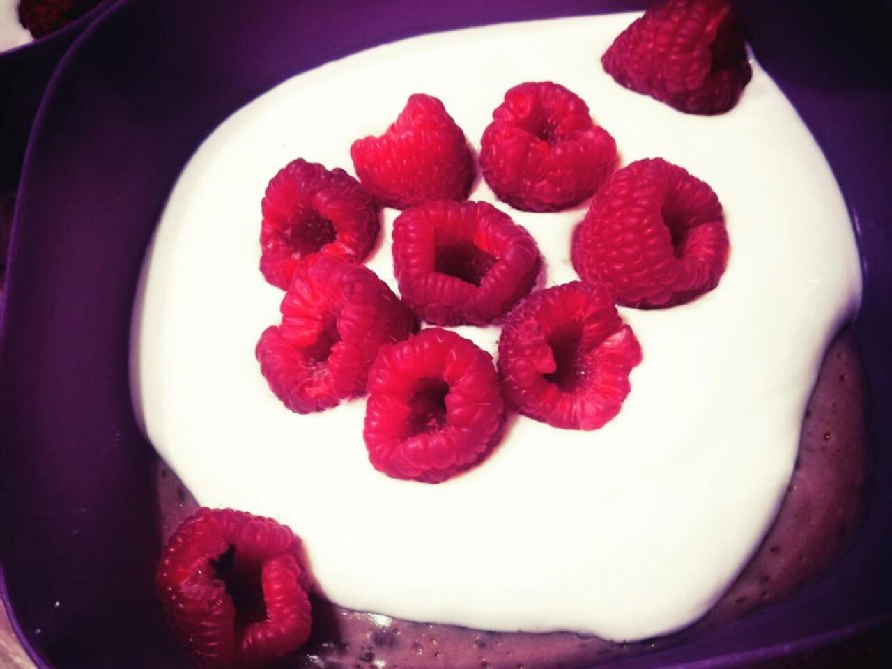 Ďalším krokom je kyslá smotana. Do tej si nasypeme cukor podľa chuti a vymiešame. Puding si nalejeme do misiek a smotanu opatrne nalejeme nato potom poukladáme maliny a môžme podávať :)