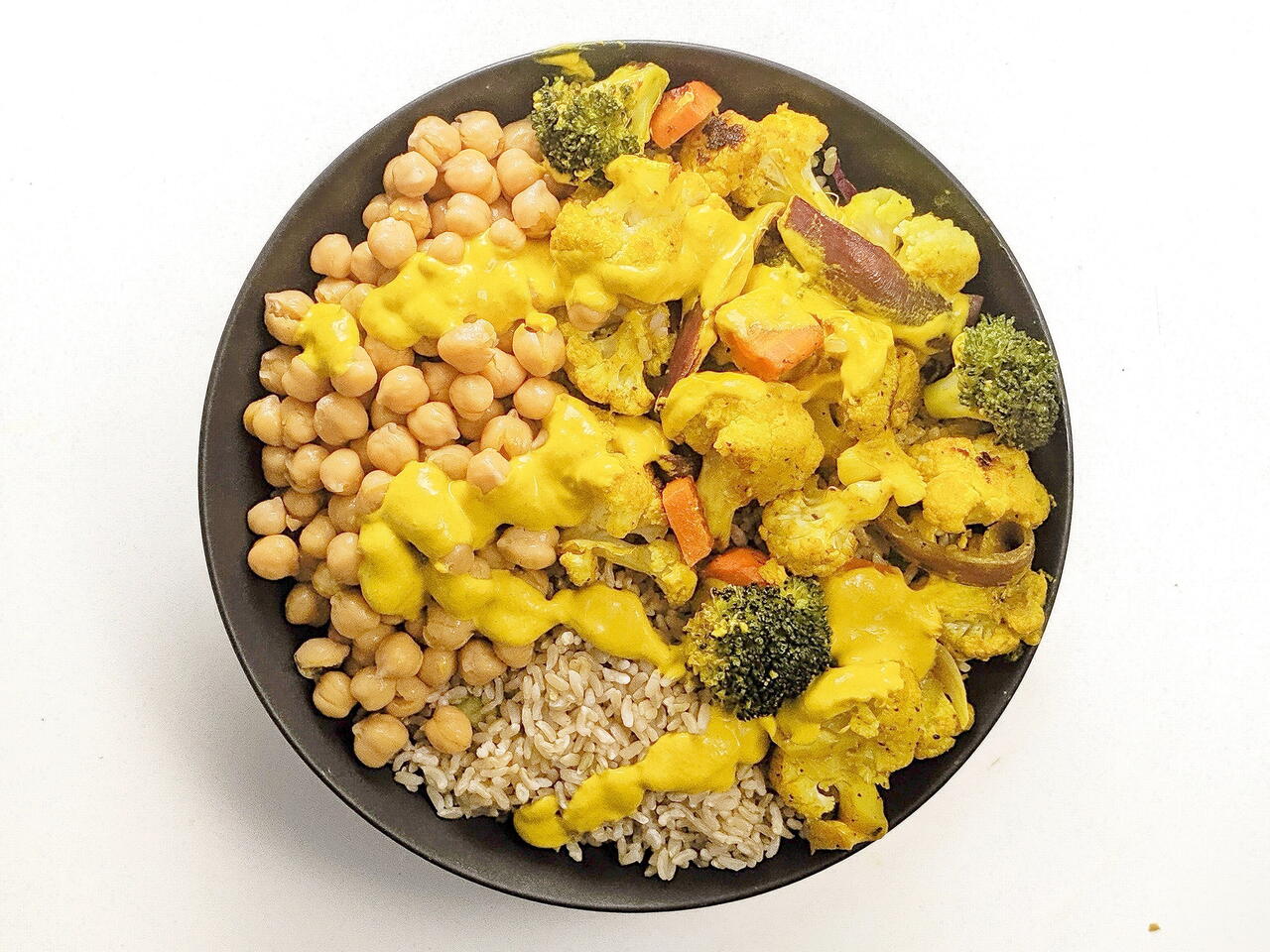 Hnedú ryžu rovnomerne rozdeľte do štyroch misiek a na vrch dajte opečenú zeleninu a cícer. Zalejte kurkumovým dressingom z tahini, premiešajte a ihneď podávajte.