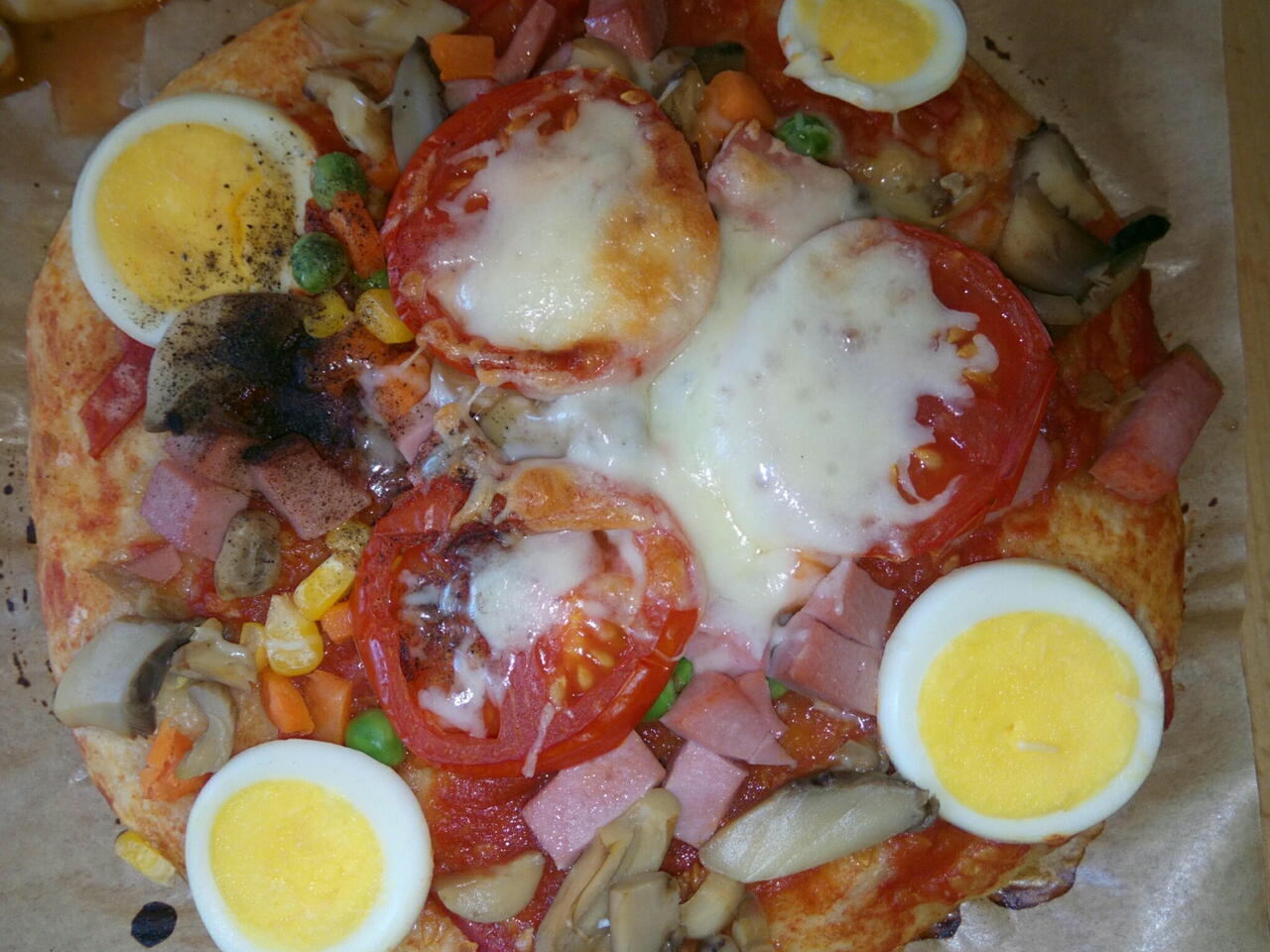 Potrieme cesto zmesou z panvice. Poukladáme nakrájané šampiňóny, kukuricu, nakrájané paradajky. Okoreníme. Necháme chvíľu kysnúť.