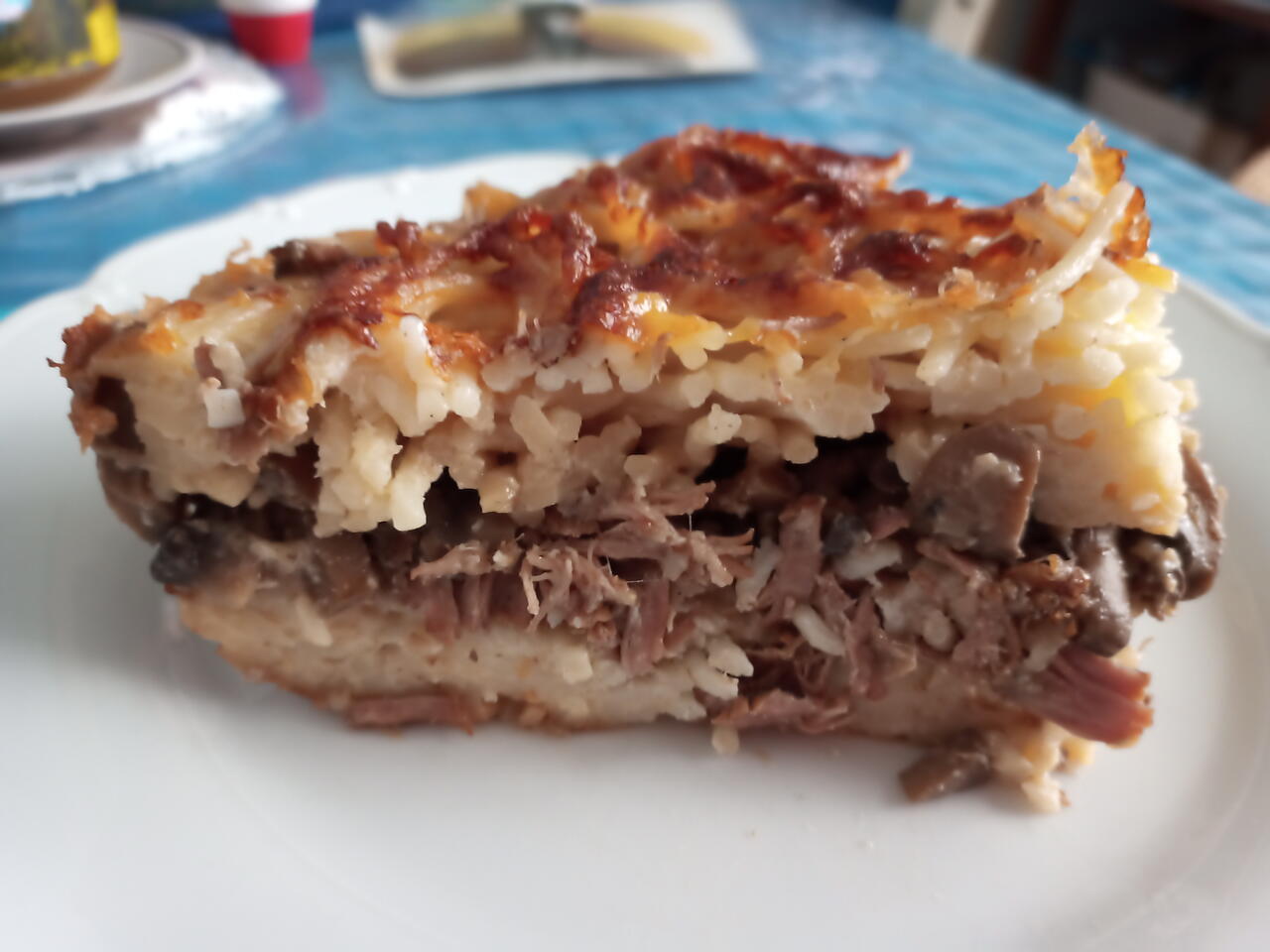 Špagety zmiešame s bešamelom. Do jenskej misy, vymastenej maslom, položíme polovicu špagiet, poukladáme mäso a šampiňóny. Vylejeme šťavu. Dáme druhú polovicu špagiet. Navrch postrúhaný syr a plátok masla a jemne polejeme smotanou.