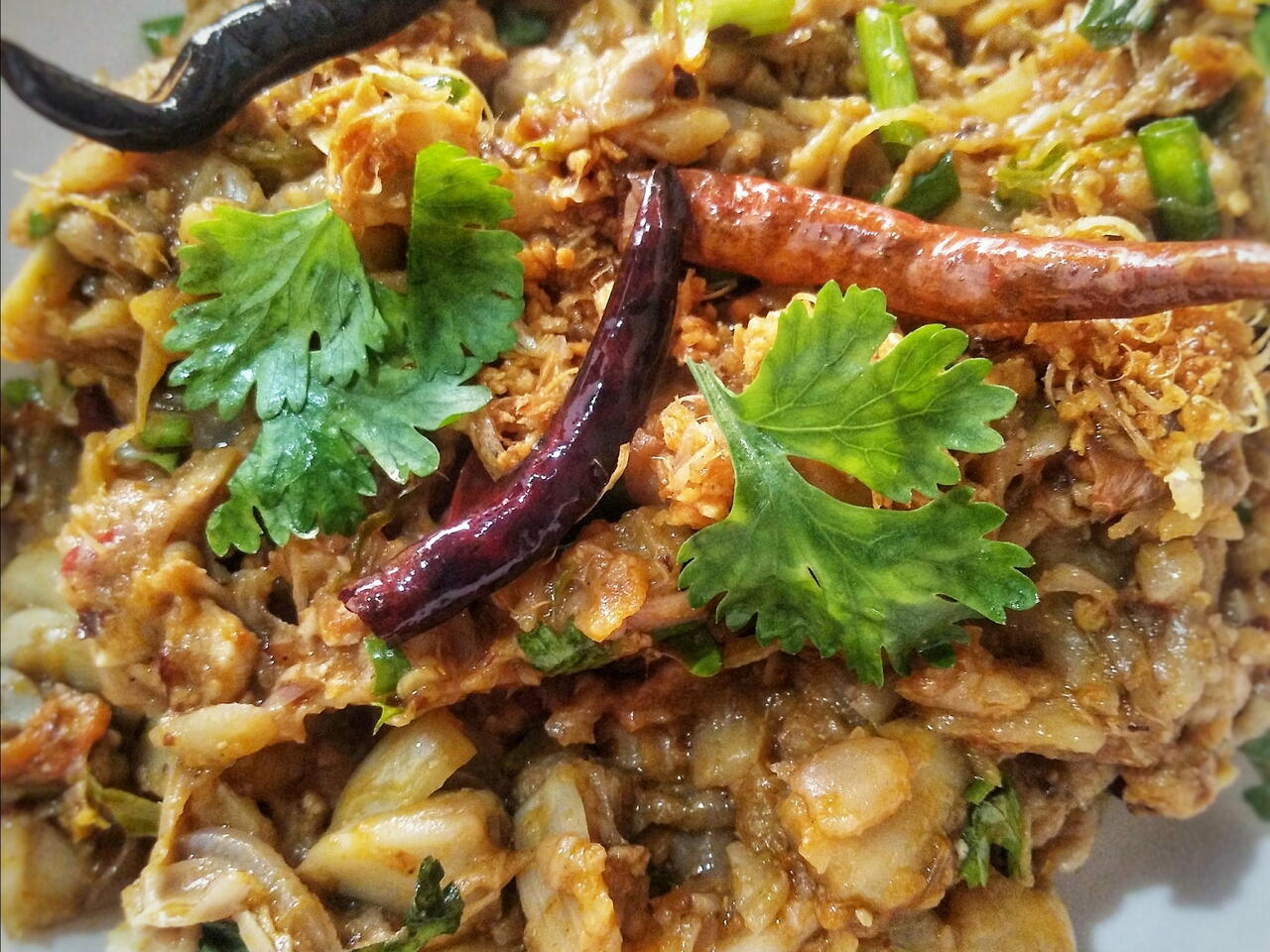ผัดส่วนผสม ประมาณ. 10 นาที. ตักใส่จาน. ตกแต่งด้วย. พริกทอด ใบผักชี. ดังรูป