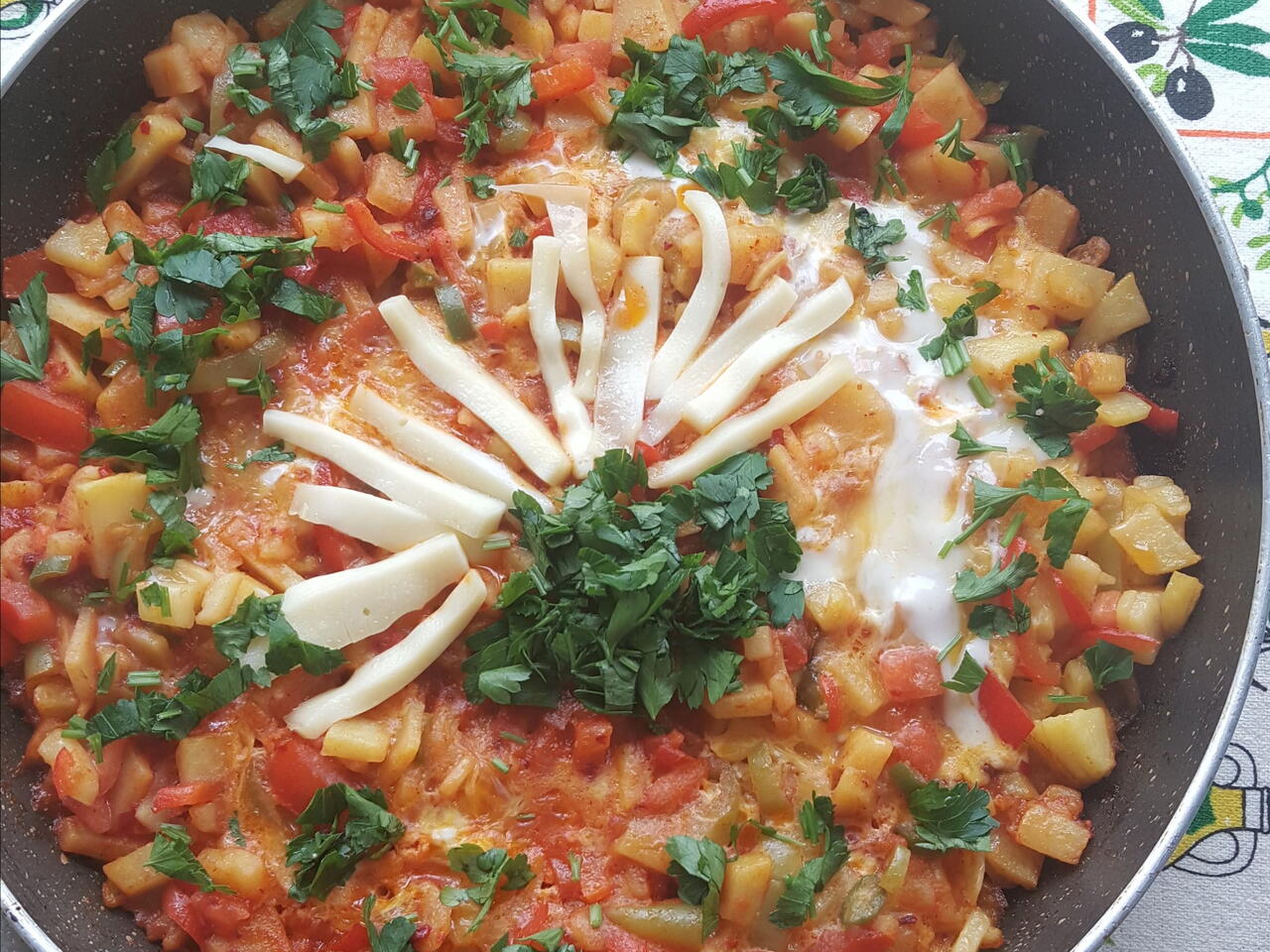 Bir süre de bu şekilde pişirdikten sonra yumurtalarımızı bir kapta çırpıp onları da tavadaki malzememize ekliyoruz ağzını kapatıp yumurtalar pişine kadar bekliyoruz. Yumurtalar da pişince artık domatesli yumurtalı patatesimiz hazır. 🤩 Ooohh böyle söylerken yorucuymuş. 😅Afiyet olsun 🍽