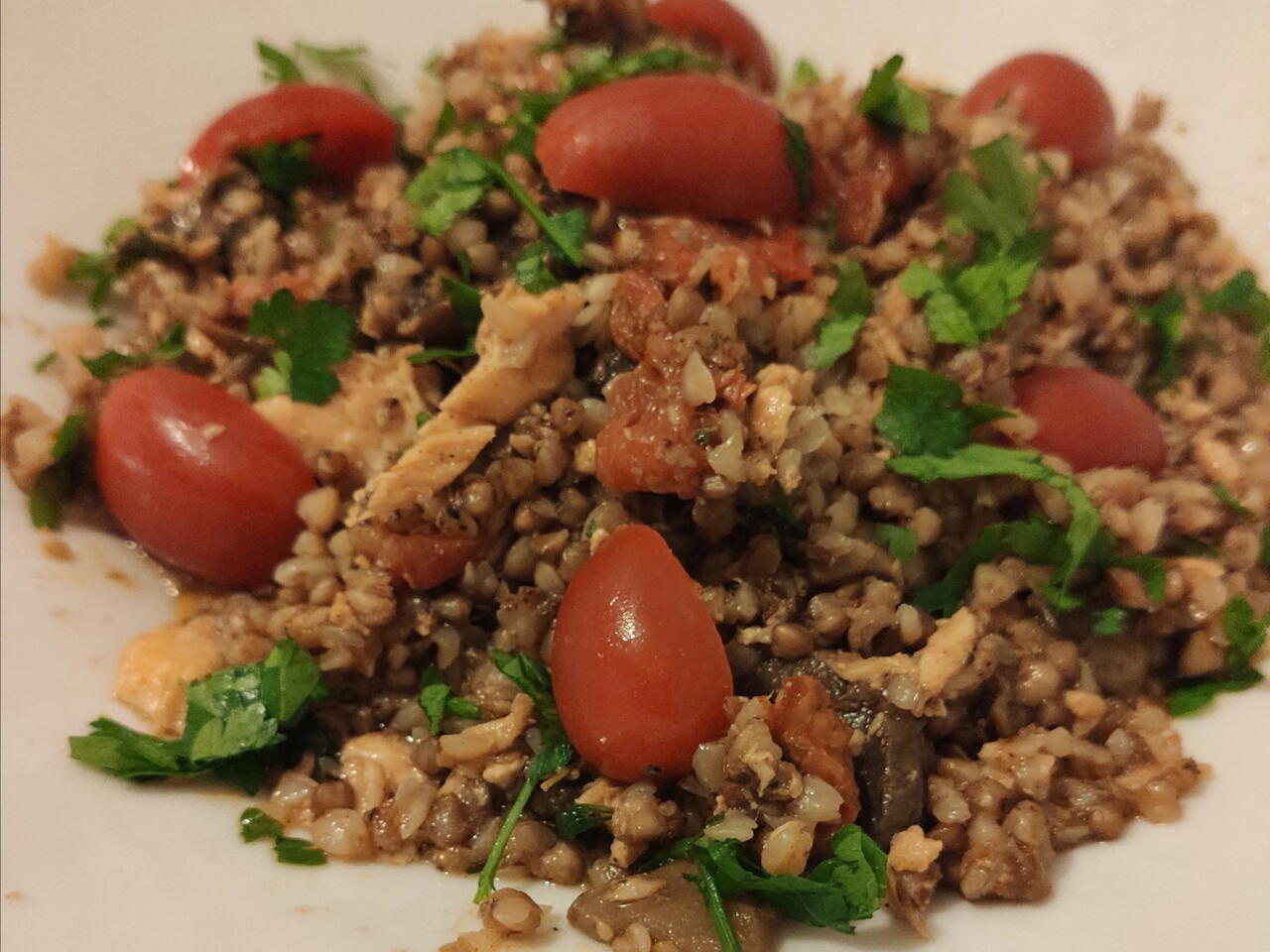 Перекласти в тарілку. Посипати нашаткованою петрушкою та викласти (жить красиво нє запрєтіш 😄) розрізані навпіл томати чері.