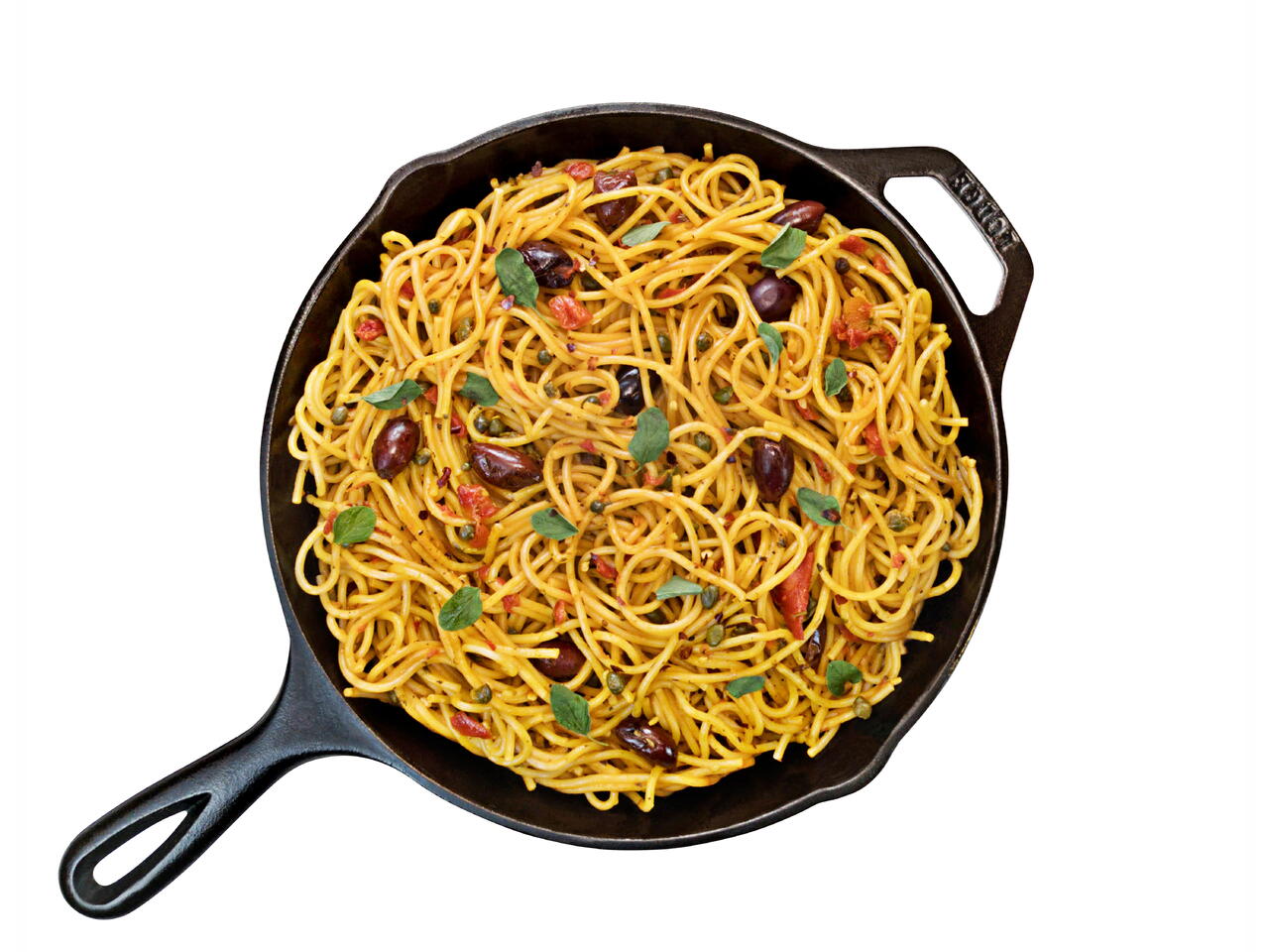 Add the spaghetti. A great way to keep the noodles from sticking together is by standing the spaghetti straight up in the middle of the pot and letting it go. The spaghetti should fall outward in an evenly spaced fan. Let the noodles soften and sink into the sauce.