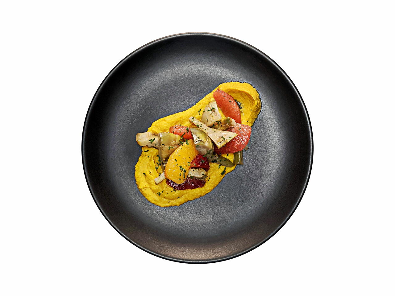 Serve artichoke and citrus salad on a base of the vegetable puree.