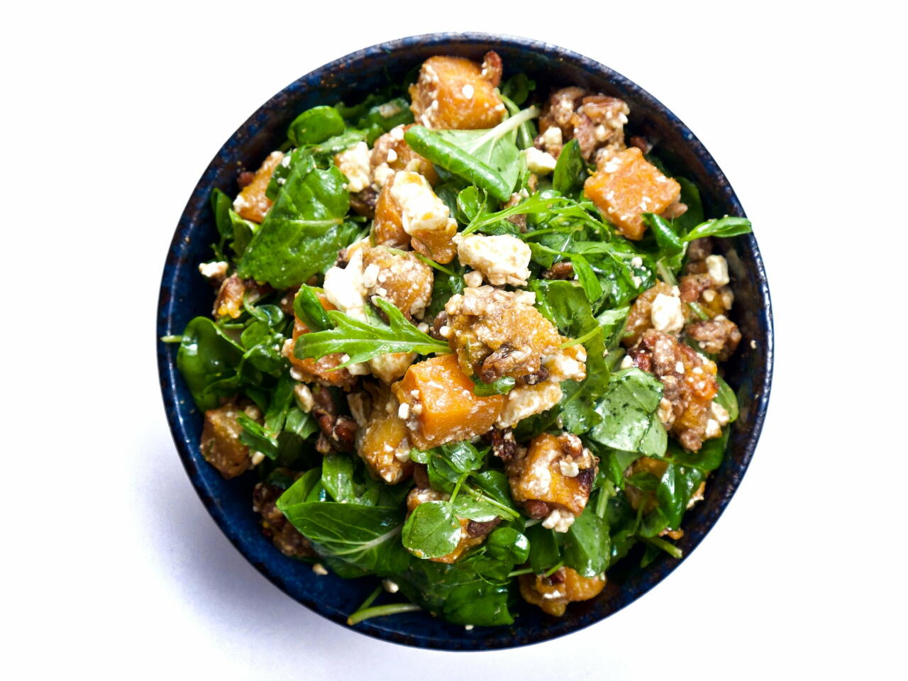 A fall salad of mixed greens and honey roasted butternut squash with pecans in a simple lemon vinaigrette.