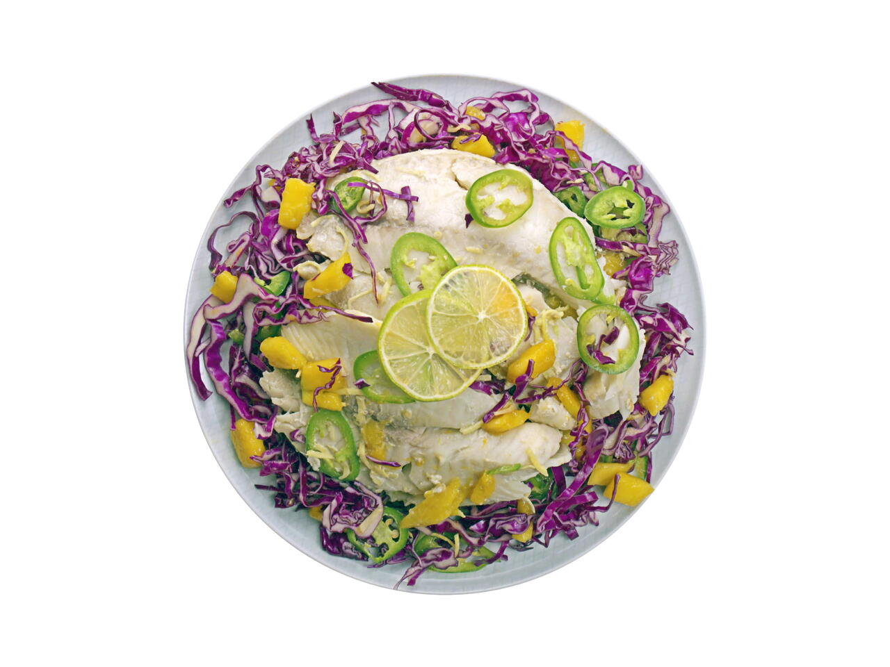 Clean eating, cheap and easy. Tilapia can be pretty boring, but we liven it up here with spicy jalapeño slices, sweet mango chunks, and shredded cabbage.