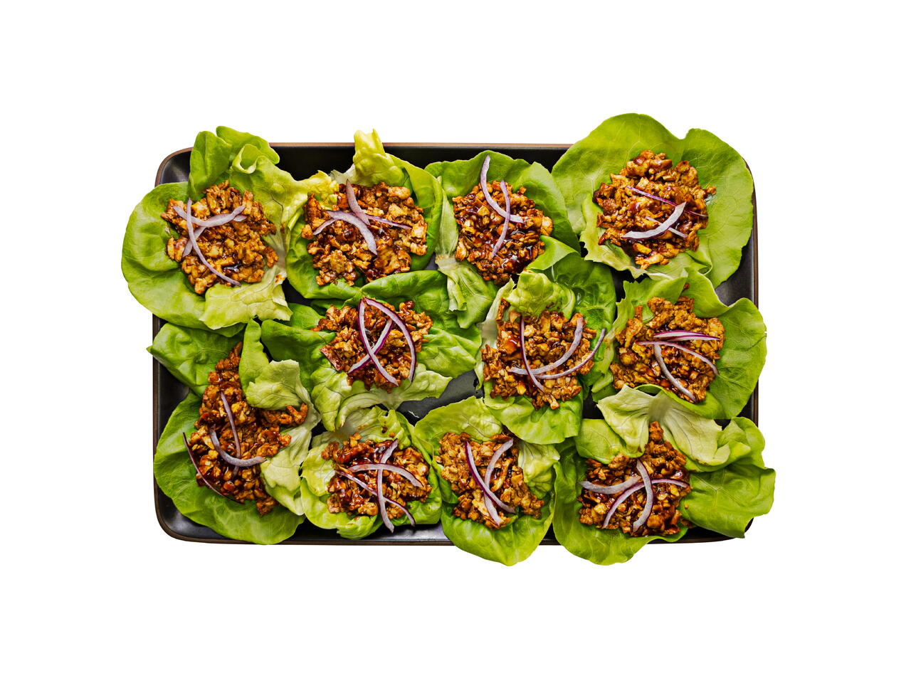 Rinse and lay out the lettuce leaves on a platter. Fill with the shredded tofu and top with a few thinly sliced red onions if you like.