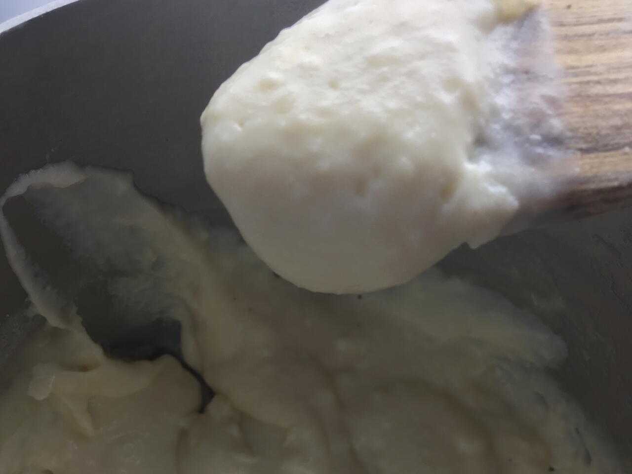 All set. Pour in the milk. Keep stirring over hear until it thickens up. Season with salt and pepper and a little nutmeg. Don't season too aggresively because you usually use this sauce in another dish, so you can fine tune later.