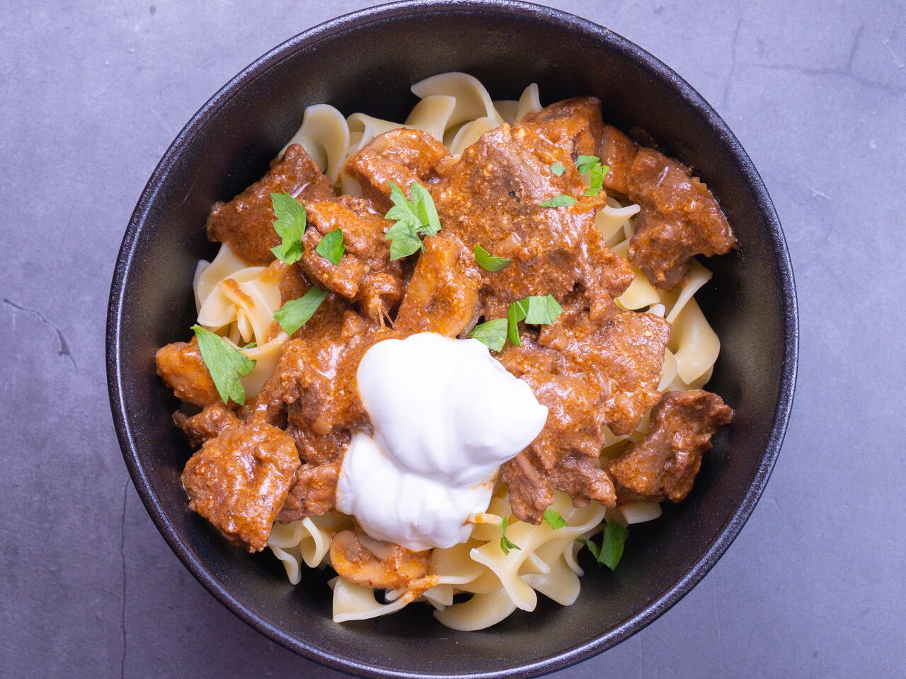 Slice the beef against the grain into strips. Stroganoff is meant to cook quickly, so the strips should be quite thin.