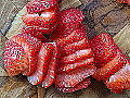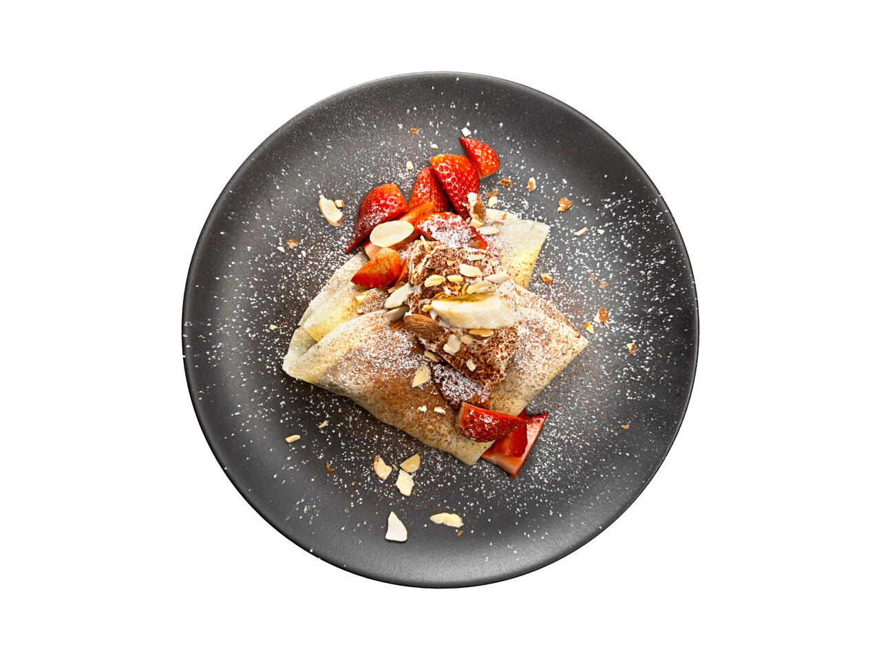 Add the banana slices to the top of the chocolate hazelnut spread in a thin layer. Fold the crepe over the bananas in half, and then into a fan shape. Top with strawberries.