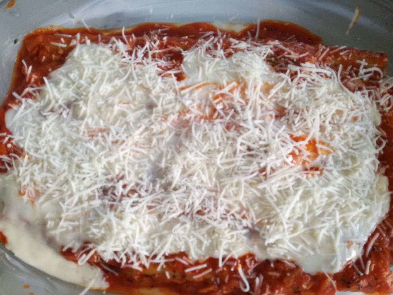 Each one put in water and then put stuffing and put on the plate then add red sauce then sauce bechamel and then cheese.