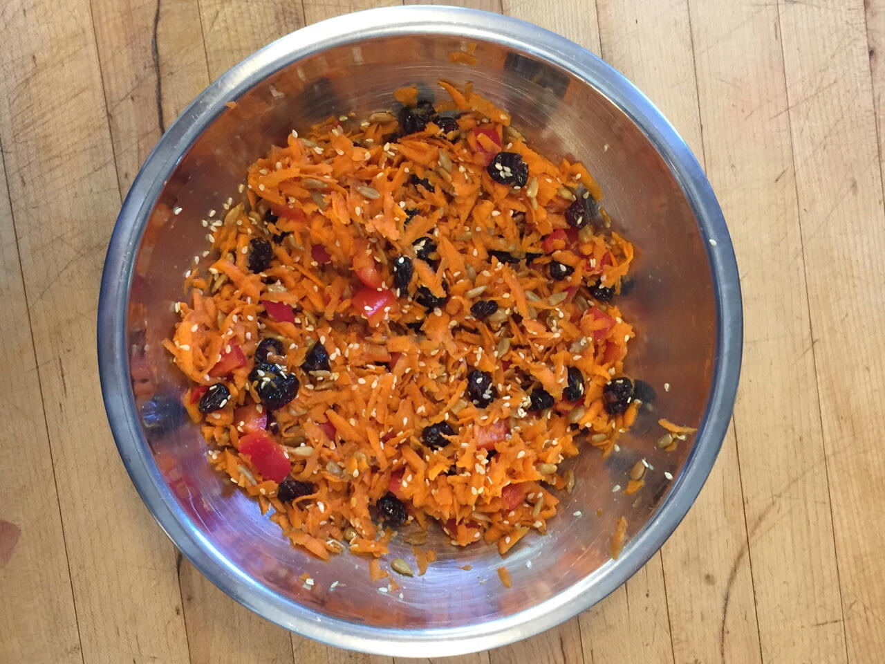 Combine carrots, peppers, raisins, and sunflower seeds in a bowl.