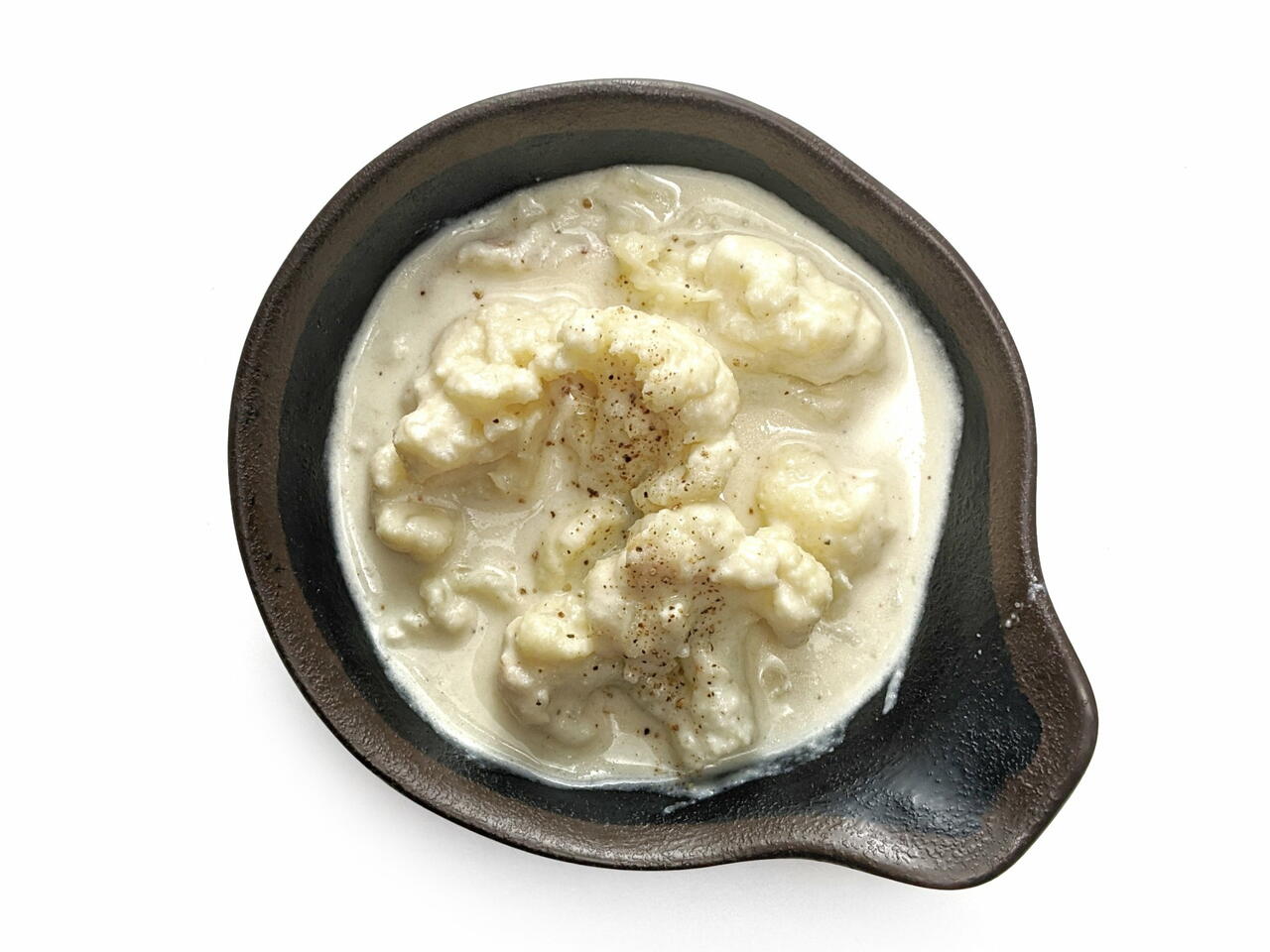 Add the cauliflower florets. Cook, stirring constantly until the cream is warm enough to melt the cheese. Reduce the heat to low and cover. Cook for about 4 minutes, or just until the cauliflower is tender. It's important to bring the temperature gently, as the cream can easily scorch or separate and leave you with a thin sauce with brown chunks in it.