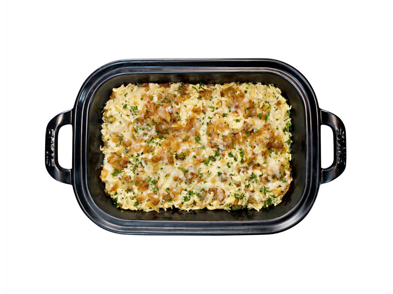 Repeat the layers with the remaining spaetzle, cheese, and caramelized onions.