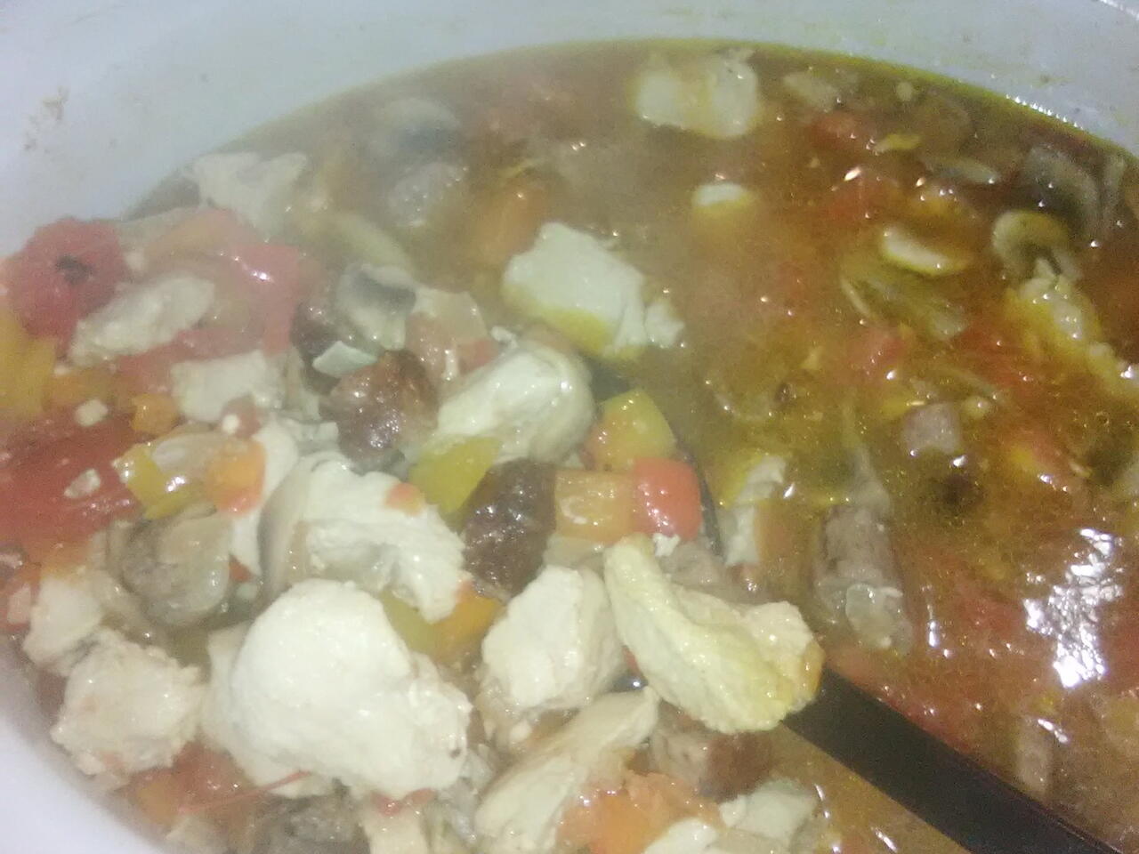 Cook chicken and sausage first slice up vegetables make a soup base throw all in a slow cooker for couple hours season to taste every 30min.