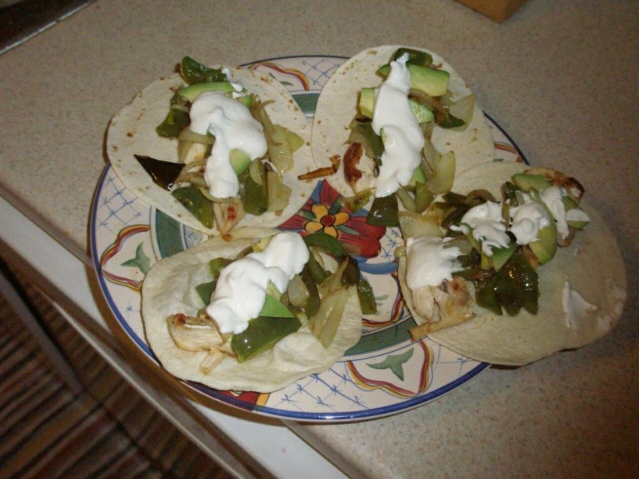 Season chicken with Goya. Sautee chicken and veggies separately, seasonings with salt and pepper. Serve in tortillas with sour cream and slices avocados.