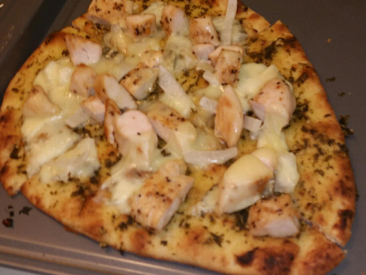 First, put 1 and 1/2 spoonfuls of pesto on each Naan and brush until it covers the entire piece. Then sprinkle your onion, cilantro, and chicken.