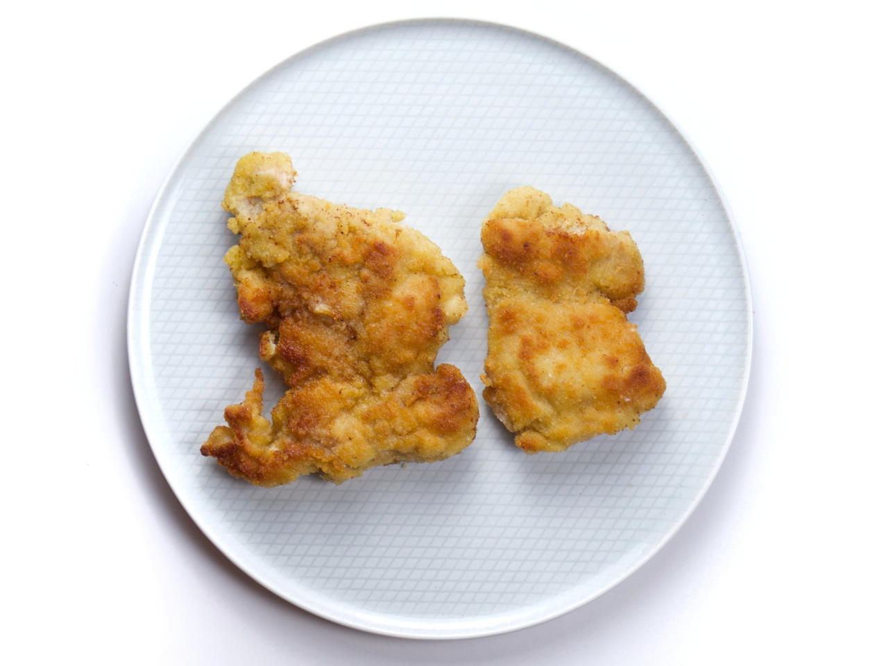 Place breaded chicken thighs gently in the hot oil. Cook until browned on one side. If your pan does not heat evenly, you may need to rotate the cutlet half way through cooking. Flip and brown the opposite side. Once browned, they should be cooked through. But you can slice into the thickest part of a chicken thigh and check for pink to make sure it is cooked thoroughly. Or use a meat thermometer to ensure that the