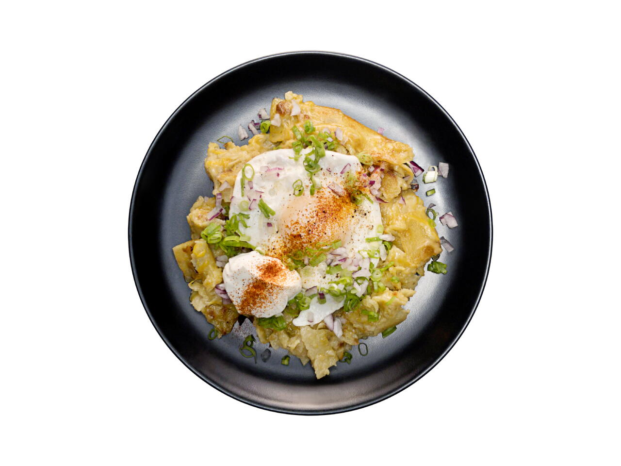 This dish can vary wildly depending on who you talk to. The basic premise here is to fry up some old tortillas with eggs and a spicy sauce.