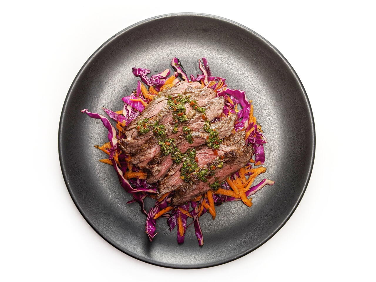 Serve sliced steak over a pile of cabbage and carrots with a healthy topping of chimichurri.