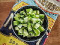 Slice the cucumbers in half lengthwise. Peeling the cucumbers is a good idea because they will pick up the dressing a little better, but you can skip it if you're feeling lazy. Scoop out the seeds with a spoon. slice lengthwise down each half twice to yield 6 total long strips of cucumber, then dice it up.