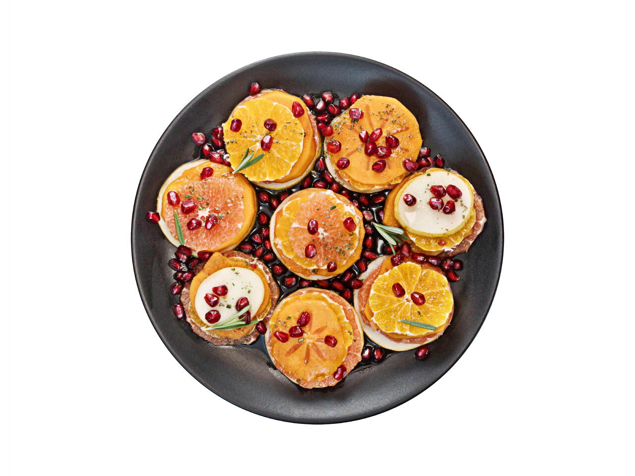 Create stacks of persimmon, pear, grapefruit, and clementine slices.